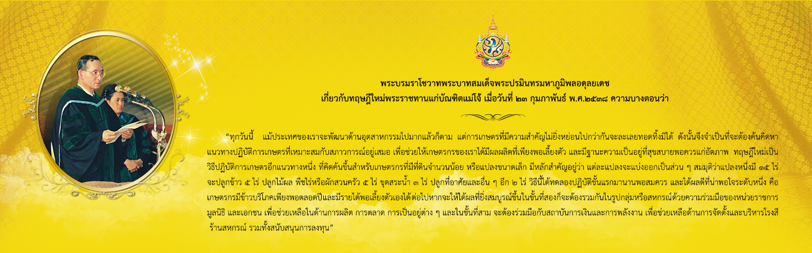 วันที่ 23 กุมภาพันธ์ 2538 พระบาทสมเด็จพระปรมินทรมหาภูมิพลอดุลยเดช ได้ทรงประกาศเกษตรทฤษฎีใหม่ในพิธีพระราชทานปริญญาบัตรแก่บัณฑิตแม่โจ้ ณ อาคารแผ่พืชน์ สถาบันเทคโนโลยีการเกษตรแม่โจ้ ความว่า “...ทฤษฎีใหม่เป็นวิธีปฏิบัติการเกษตรอีกแนวทางหนึ่งสำหรับเกษตรกรที่มีที่ดินจำนวนน้อย มีหลักสำคัญอยู่ว่า แต่ละแปลงจะแบ่งออกเป็นส่วน สมมติว่าแปลงหนึ่งมี 15 ไร่ จะปลูกข้าว 5 ไร่ ปลูกไม้ผล พืชไร่ และพืชผัก สวนครัว 5 ไร่ ขุดสระน้ำ 3 ไร่ ปลูกที่อยู่อาศัยและ อื่นๆ อีก 2 ไร่ วิธีนี้ได้ทดลองปฏิบัติขั้นแรกมานานพอสมควร และได้ผลดีที่น่าพอใจระดับหนึ่ง ในขั้นที่สองก็จะต้องรวมกันในรูปกลุ่มหรือสหกรณ์ ด้วยความร่วมมือของหน่วยราชการ มูลนิธิและเอกชน เพื่อช่วยเหลือในด้านการผลิต การตลาด และในขั้นที่สามจะต้องร่วมมือกับสถาบันการเงินและการพลังงาน เพื่อช่วยเหลือด้านการจัดตั้งและบริหารโรงสีร้านสหกรณ์ รวมทั้งสนับสนุนการลงทุน...” มหาวิทยาลัยแม่โจ้ได้สนองพระบรมราโชวาทจึงได้ตั้งฐานเรียนรู้เกษตรทฤษฎีใหม่ฯ ขึ้น และดำเนินการ เผยแพร่องค์ความรู้เรื่อยมา
